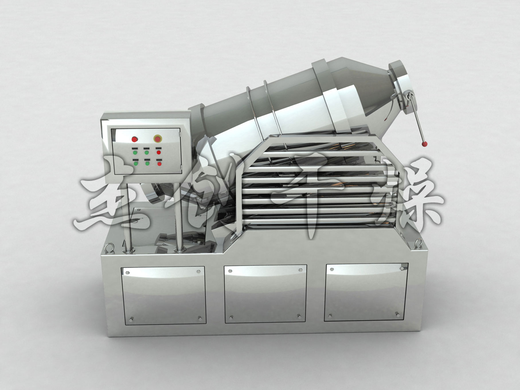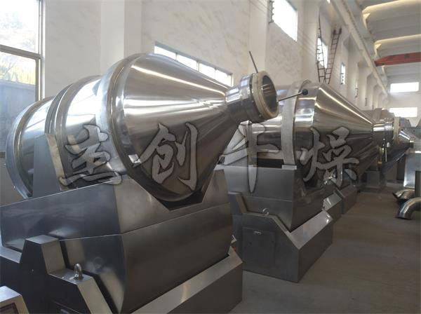 EYH 二維運(yùn)動(dòng)混合機(jī)的轉(zhuǎn)筒可同時(shí)進(jìn)行二個(gè)運(yùn)動(dòng),一個(gè)為轉(zhuǎn)筒的轉(zhuǎn)動(dòng),另一個(gè)為轉(zhuǎn)筒隨擺動(dòng)架的擺動(dòng)。被混合物料在轉(zhuǎn)筒內(nèi)隨轉(zhuǎn)筒轉(zhuǎn)動(dòng)、翻轉(zhuǎn)、混和的同時(shí),又隨轉(zhuǎn)筒的擺動(dòng)而發(fā)生左右來回的摻混運(yùn)動(dòng),在這兩個(gè)運(yùn)動(dòng)的共同作用下,物料在短時(shí)間內(nèi)得到均勻的混合。EYH二維混料機(jī)適合所有粉、粒狀物料的混合。