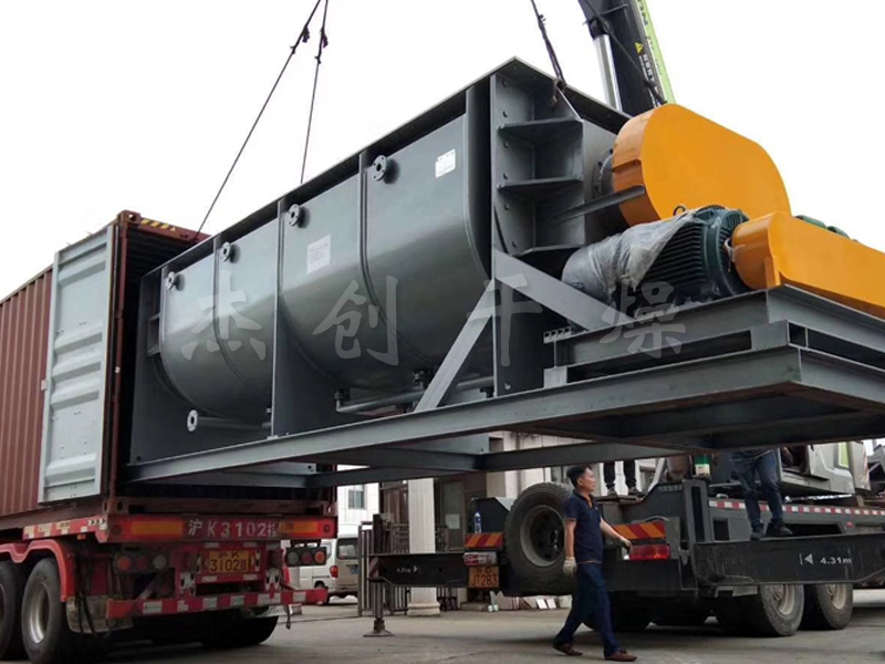 空心軸上密集排列著楔型中空漿葉,熱介質經空心軸流經漿葉。單位有效容積內傳熱面積很大,熱介質溫度從-40℃到320℃,可以是水蒸汽,也可以是液體型:如熱水、導熱油等。間接傳導加熱,沒有攜帶空氣帶走熱量,熱量均用來加熱物料。熱量損失僅為通過器體保溫層向環境的散熱。楔型漿葉傳熱面具有自清潔功能。物料顆粒與楔型面的相對運動產生洗刷作用,能夠洗刷掉楔型面上附著物料,使運轉中一直保持著清潔的傳熱面。漿葉干燥機的殼體為W型,殼體內一般安排二到四根空心攪拌軸。殼體有密封端蓋與上蓋,防止物料粉塵外泄而發揮作用。