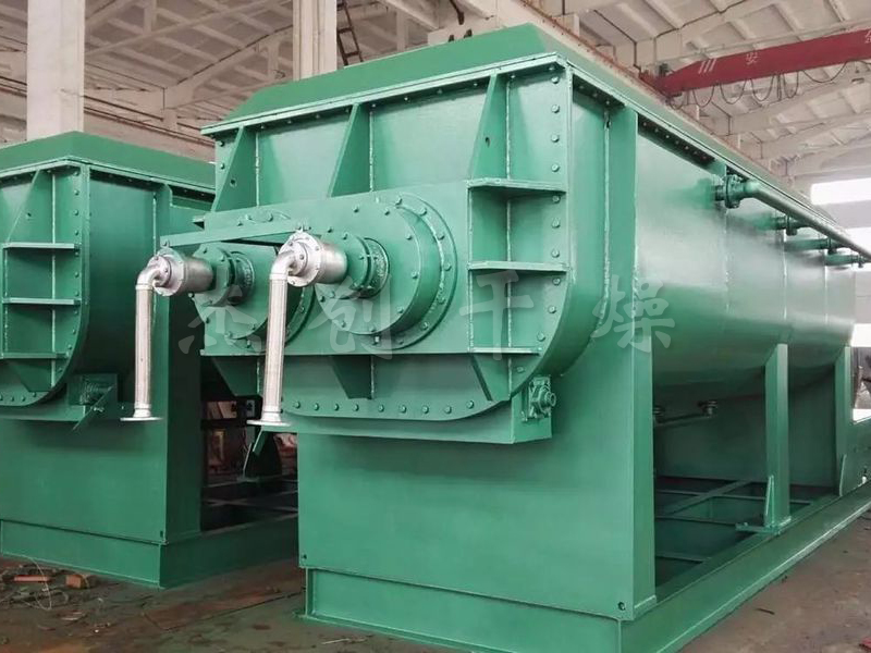 空心軸上密集排列著楔型中空漿葉,熱介質經空心軸流經漿葉。單位有效容積內傳熱面積很大,熱介質溫度從-40℃到320℃,可以是水蒸汽,也可以是液體型:如熱水、導熱油等。間接傳導加熱,沒有攜帶空氣帶走熱量,熱量均用來加熱物料。熱量損失僅為通過器體保溫層向環境的散熱。楔型漿葉傳熱面具有自清潔功能。物料顆粒與楔型面的相對運動產生洗刷作用,能夠洗刷掉楔型面上附著物料,使運轉中一直保持著清潔的傳熱面。漿葉干燥機的殼體為W型,殼體內一般安排二到四根空心攪拌軸。殼體有密封端蓋與上蓋,防止物料粉塵外泄而發揮作用。