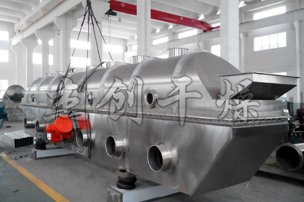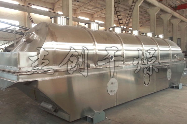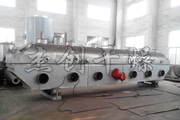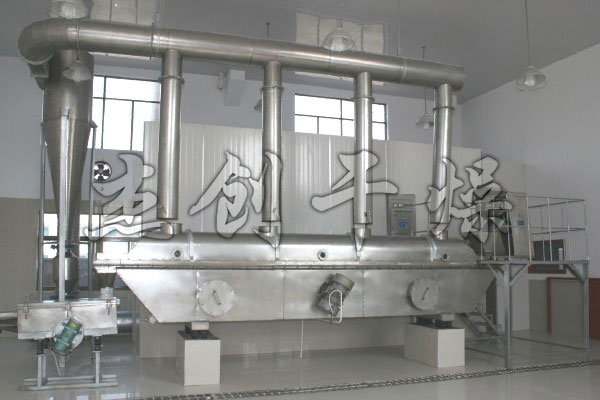 物料自進料口進入機內, 在振動力作用下, 物料沿水平方向拋擲向前連續運動,熱風向上穿過流化床同濕料換熱后, 濕空氣經旋風分離器除塵后由排風口排出, 干燥物料由排料口排出。